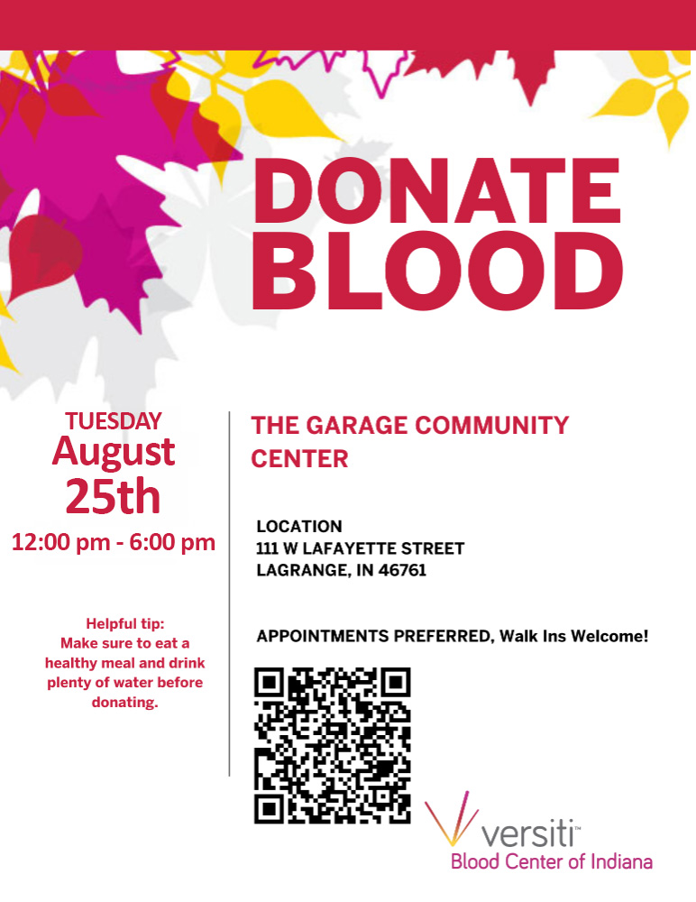 The Garage 111 W Lafayette St., LaGrange, IN, United States"Giving blood at Versiti is nothing to be afraid of. The time flies by when you listen to music or a podcast! Because each donation can save up to three lives, every donor makes a difference. Local hospital patients are counting on you. Give it a try. Give back. Give blood. When you give blood, you offer hope. A more varied donor community means more lives saved and healthier futures made possible (Versiti, n.d.)." "Donate today! Every day, patients in your community need blood transfusions to survive and thrive. They rely on the generosity of donors like you, who help ensure a safe, healthy blood supply. Make an appointment to donate blood today" (Versiti, n.d.).